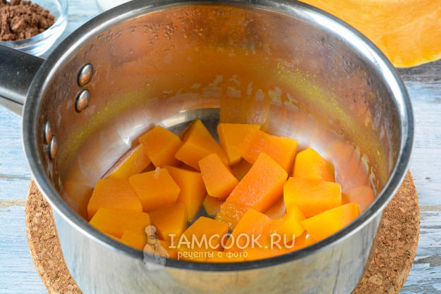 Тыкву почистите и нарежьте небольшими кусочками. Варите в кипящей воде 15-20 минут. После чего всю оставшуюся жидкость слейте.