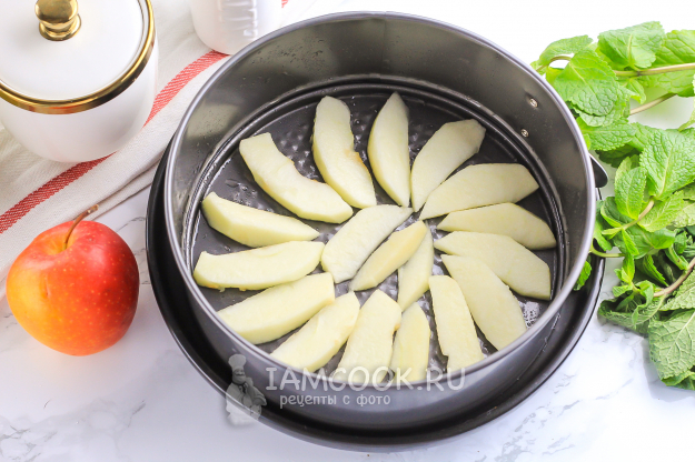 Яблоки очистите от кожуры, разрежьте на четвертинки и срежьте семенные блоки. Затем мякоть промойте и просушите бумажной салфеткой, удаляя лишнюю влагу. Нарежьте дольками. Сбрызните или смажьте форму растительным маслом, заходя и на бортики. Выложите яблочную нарезку на дно формы.