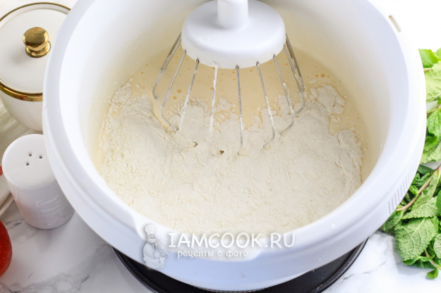 Взбейте всё на высокой скорости техники в пышную пену, примерно 3-4 минуты. Влейте кефир любой жирности и перемешайте. Прогревать его до комнатной температуры необязательно, тем более, если и яйца были тоже из холодильника.