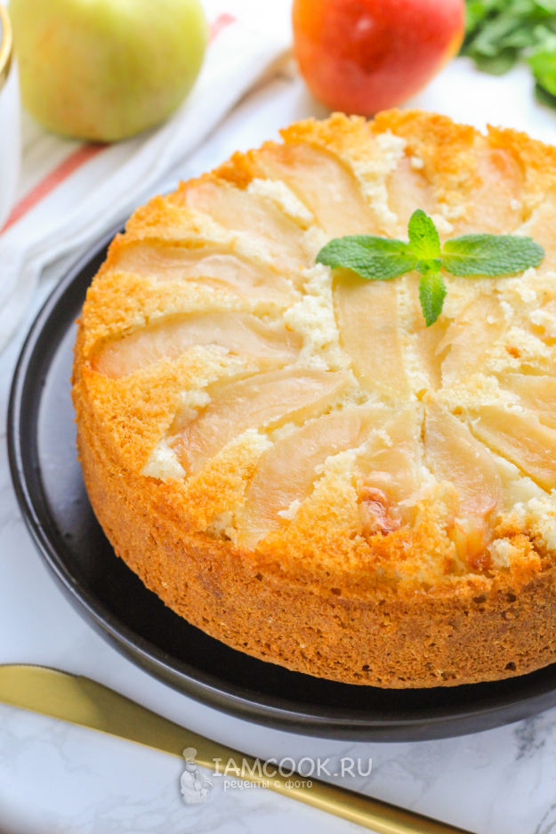 После этого срежьте верхушку и удалите бортики разъемной формы. Затем накройте пирог тарелкой и переверните дном вверх. Аккуратно удалите дно формы и дайте шарлотке слегка остыть. При желании ее можно присыпать сахарной пудрой или полить сиропом. Нарежьте выпечку на части и подайте к столу.