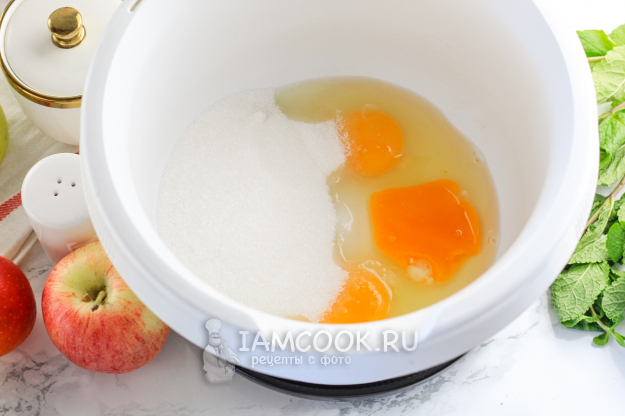 В чашу миксера или кухонного комбайна вбейте куриные яйца и всыпьте соль, сахарный песок. По желанию можно дополнить их ванильным сахаром - примерно 0,5 ч.л. Тогда выпечка приобретет яркий и манящий аромат.