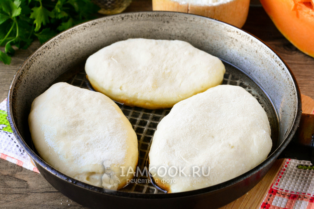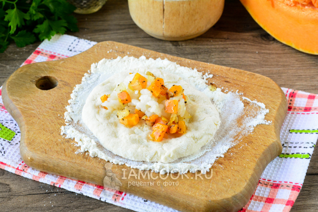 Защипните края пирожков, выложите их швом вниз и слегка прижмите ладошкой, чтобы они стали более приплюснутыми. Таким образом слепите все пирожки, наполняя их тыквенной начинкой с рисом.