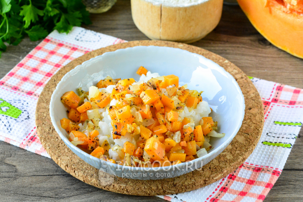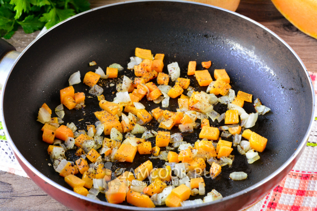 Сковороду слегка смажьте растительным маслом, обжаривайте лук с тыквой до мягкости, около 8-9 минут, сделав небольшой огонь. Слегка посолите и поперчите, добавьте сушеные прованские травы. Остудите овощи.