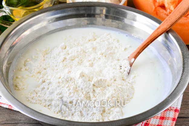 Влейте в тесто 35 мл растительного масла (рафинированного, без запаха) и постепенно всыпайте просеянную муку, разбивая все комочки.