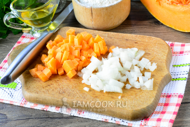 Почистите репчатый лук и тыкву, овощи нарежьте небольшими кубиками.