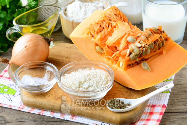 Соберите все ингредиенты для приготовления пирожков с тыквой и рисом.