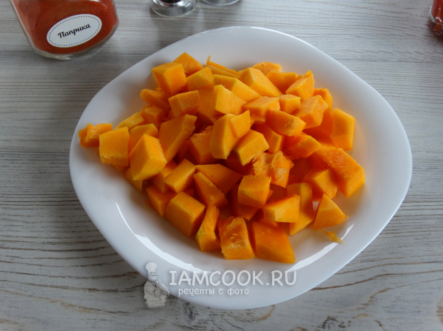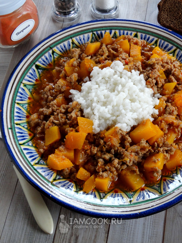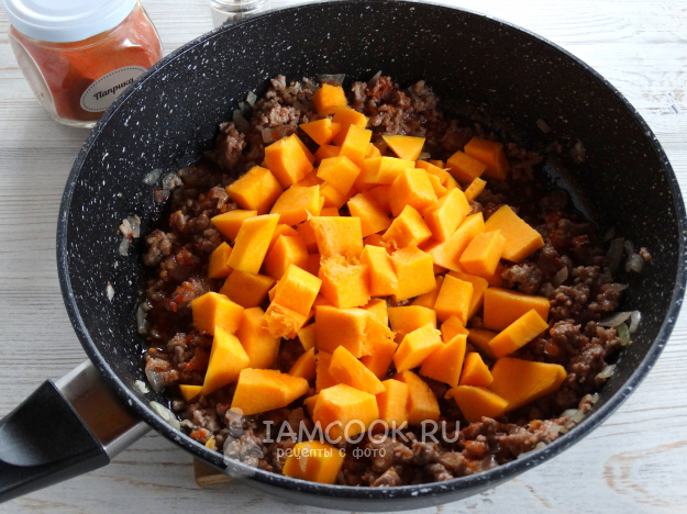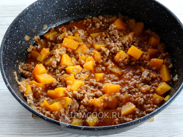 Перемешать. Если тыква не покрылась мясным соусом, то можно добавить немного воды.