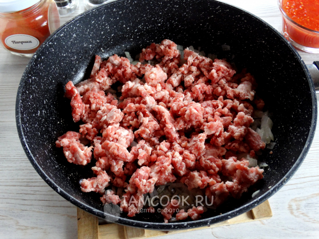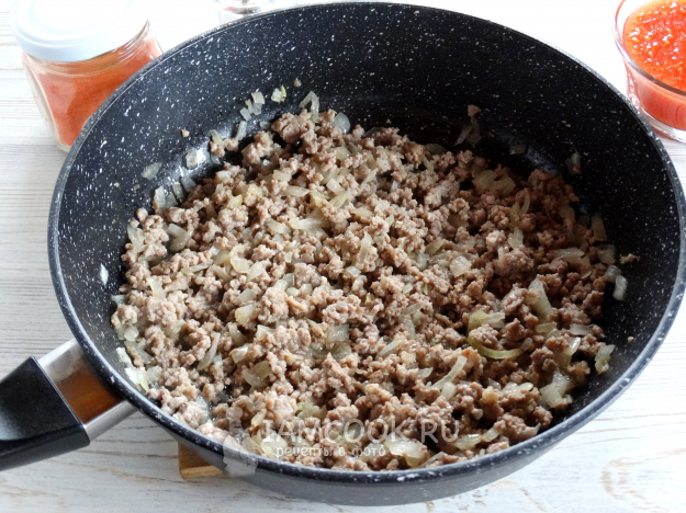 Готовить тыкву с фаршем на сковороде под крышкой, на среднем огне (чтобы не кипело), до того момента, как тыква станет мягкой.