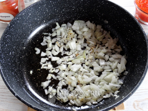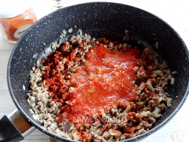 Влить в сковороду томатный соус, добавить паприку и соль с перцем (по вкусу).