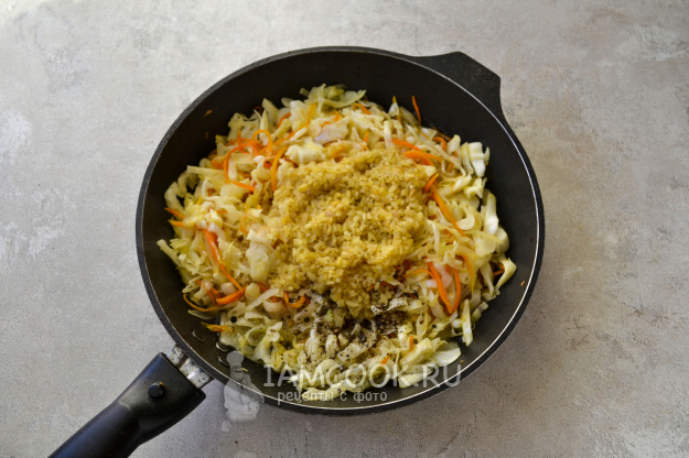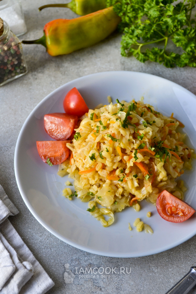 Перемешайте булгур с капустой и другими овощами и на огне выше среднего обжаривайте 3-5 минут. Затем сделайте огонь минимальным и под крышкой готовьте блюдо 15-20 минут. Если жидкость выпарится раньше, влейте еще немного горячей воды в сковороду. За время приготовления пару раз перемешайте продукты. Капуста готова, крупинки булгура мягкие, распаренные.