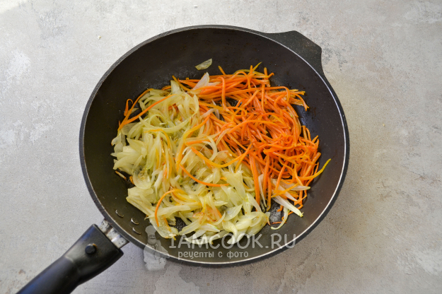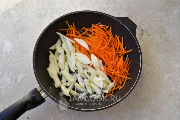 Морковь натрите на крупной терке или терке для корейских салатов. Лук нарежьте перьями. Разогрейте сковороду с растительным маслом и положите овощи.