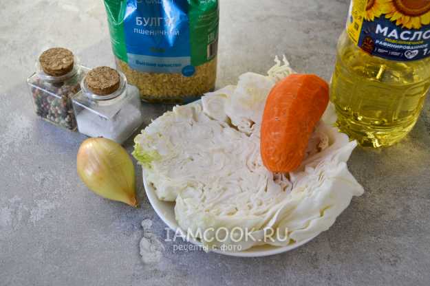 Подготовьте продукты. Капусту очистите от верхних листьев, морковь и лук почистите, булгур промойте.