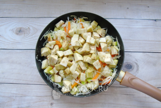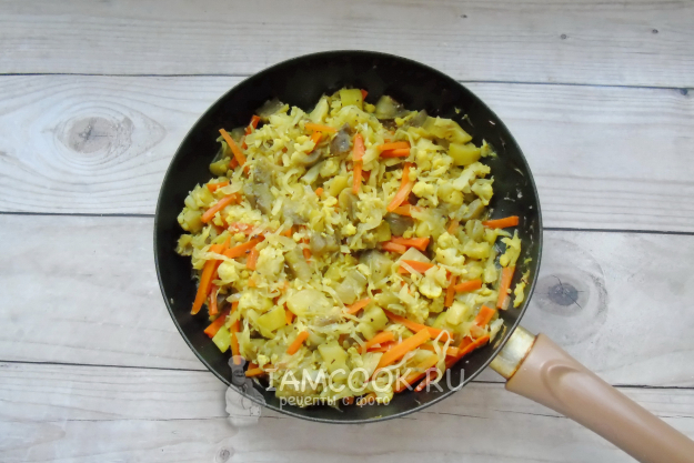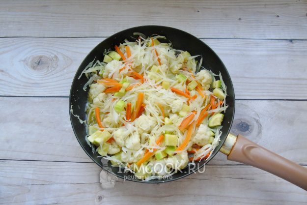 Цветную капусту помойте, разберите на небольшие соцветия. Кабачок помойте, очистите и нарежьте кубиками. Выложите в сковороду с морковью и луком.