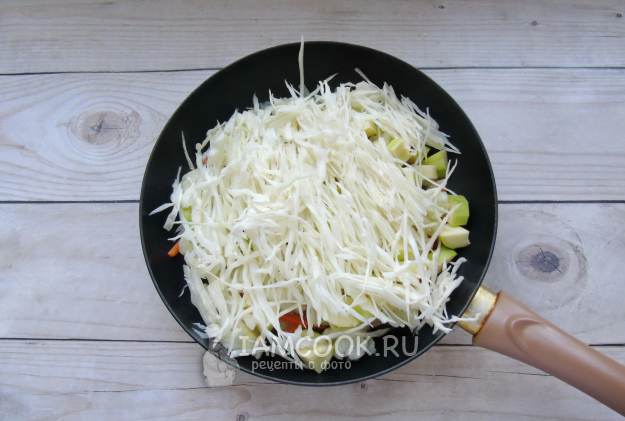Белокочанную капусту нарежьте соломкой и добавьте в сковороду.