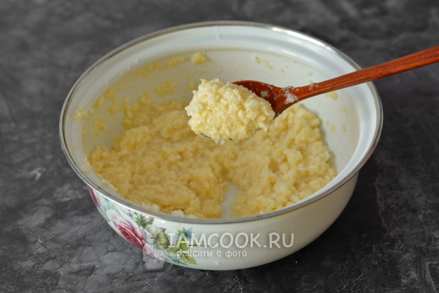 Теперь всыпьте семолину и тщательно размешайте ложкой.