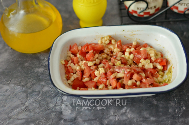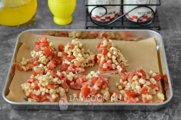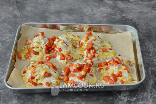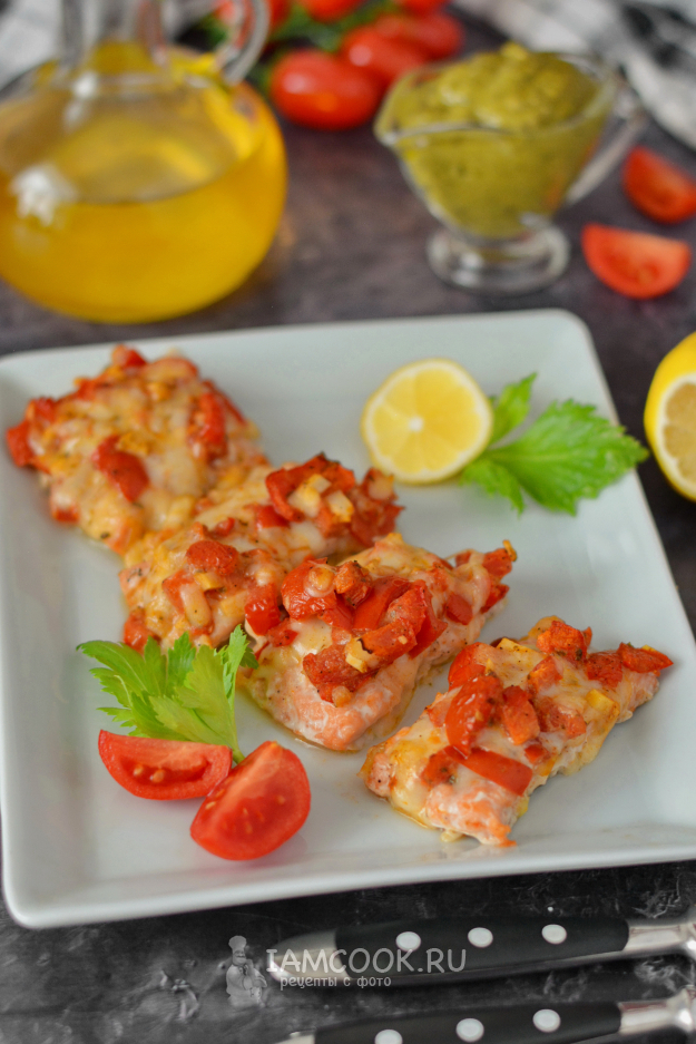Сверху на рыбу выложите сырно-помидорную "шубу" и отправьте это всё в нагретую духовку.