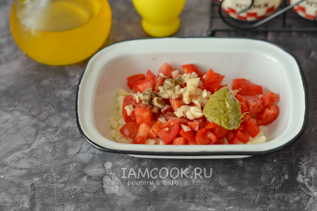 К сыру с помидорами добавьте нарубленный мелко чеснок, щепотку соли и ложечку соуса песто.