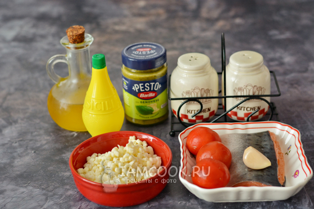 Подготовьте все необходимые продукты для запекания филе кеты в духовке с помидорами и сыром.