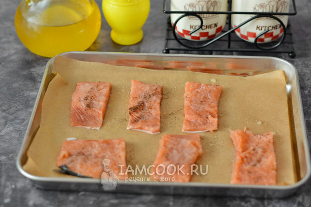 Выложите на пергамент кусочки филе кеты, посолите и поперчите их по вкусу, сбрызните немного растительным маслом.
