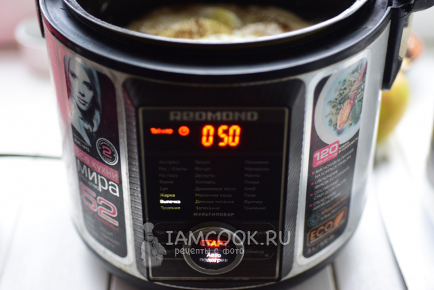 Чашу с будущим пирогом загрузим в мультиварку, установим режим "Выпечка" на 50 минут и будем ждать сигнала об окончании программы.