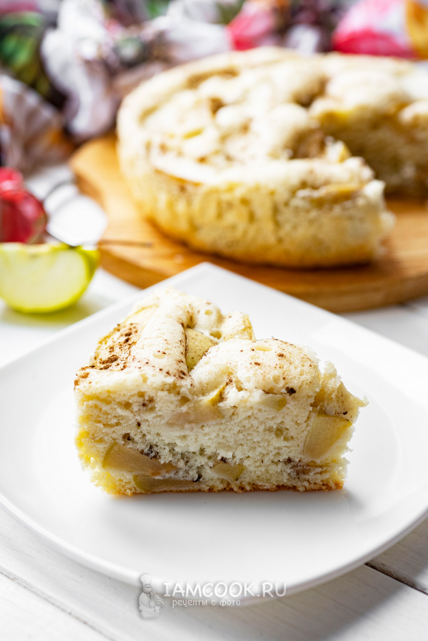 Испеченную в мультиварке пышную шарлотку с яблоками охладим и нарежем на кусочки. Приятного аппетита!