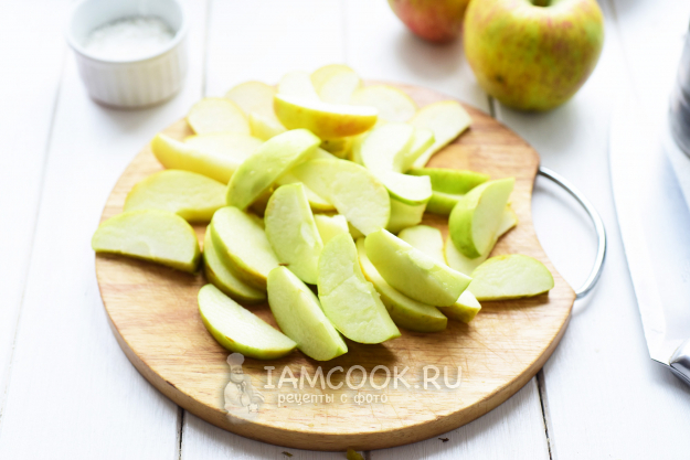 У яблок вырежем семенной отдел и нарежем яблоки на тонкие ломтики.