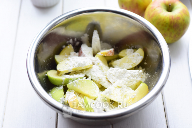 Яблочные ломтики выложим в миску, добавим крахмал и перемешаем все ложкой до равномерного распределения. Крахмалом пересыпаем яблоки, чтобы выделяющийся в процессе выпекания яблочный сок не размочил тесто.