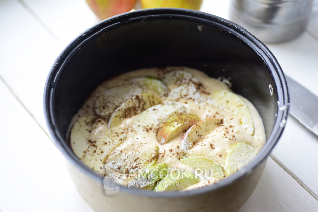 Выложим на дно чаши мультиварки круг из пергамента, соизмеримый с диаметром чаши. Затем на подготовленное дно чаши выложим половину воздушного теста и распределим поверх половину яблочных ломтиков в крахмале.