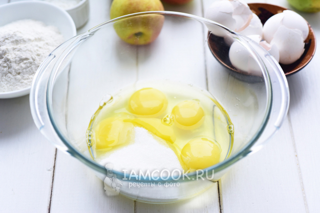 В миску вобьем яйца и добавим весь сахар.