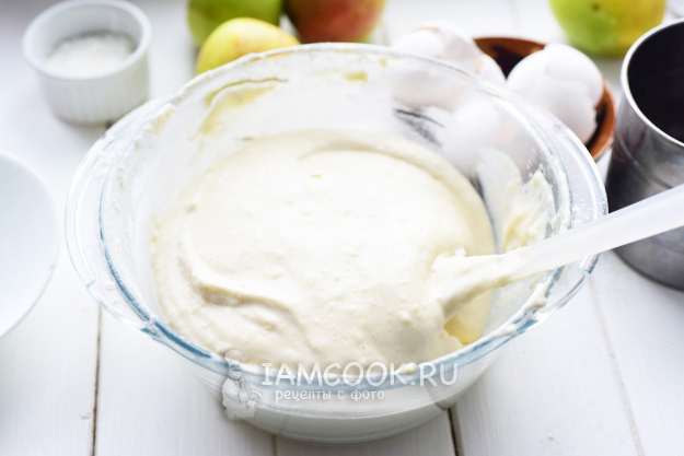 Аккуратными движениями лопатки, не нарушая воздушность всей массы, вмешаем муку до получения однородного, воздушного теста.