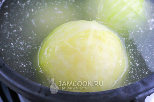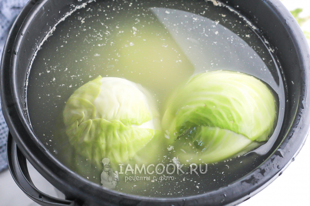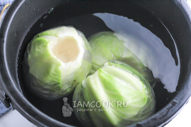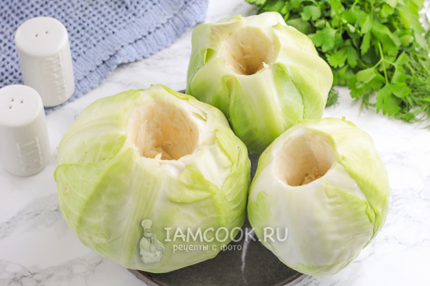 Снимите верхние листья с кочанов капусты - они выполняют защитную функцию. Вырежьте кочерыжки внутри до листьев. Благодаря этому действию кочаны просолятся быстрее, так как рассол попадет непосредственно внутрь каждого вилка.