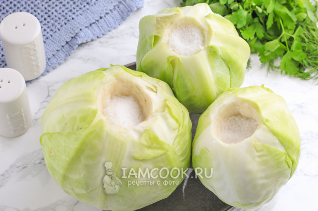 Засыпьте отверстия солью. Я не взвешивала вилки капусты, но вышло примерно 4,5 кг.