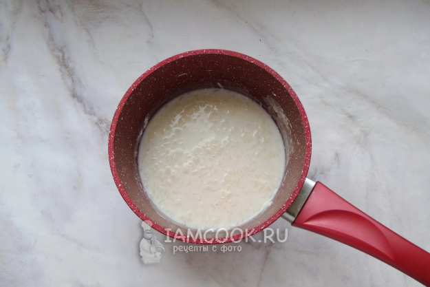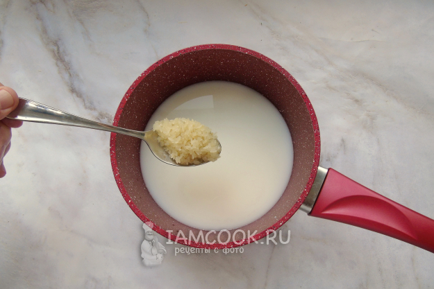 В кастрюлю налейте молоко и воду. Доведите до кипения и выложите рис, который нужно предварительно помыть.
