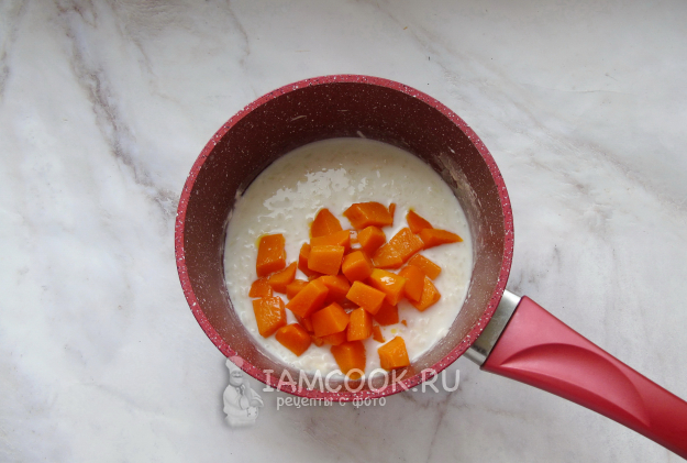 После добавьте тыкву в кастрюлю с рисом. Если суп будет густым, налейте еще молоко и перемешайте. Посолите, добавьте сахар и ванильный сахар по вкусу.