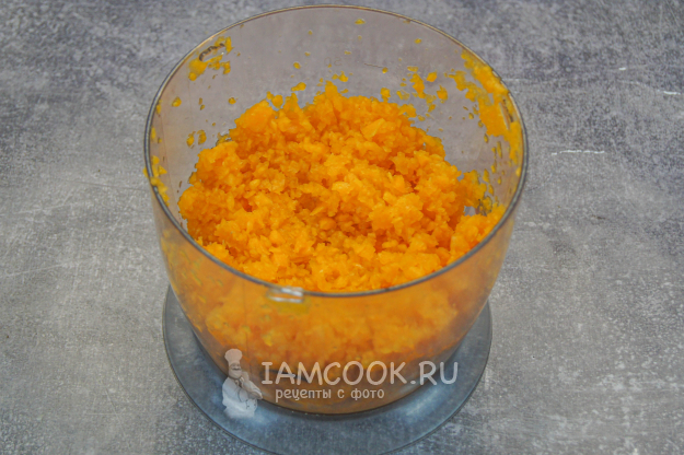 Добавляем тыкву в чашу блендера и взбиваем. Сырая тыква не взобьется до идеального состояния пюре, а будет еще немного с кусочками. Если не хотите есть сырую или не полностью пюрированную тыкву, то запеките ее в духовке около получаса, до мягкости, затем остудите.