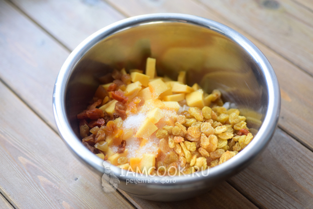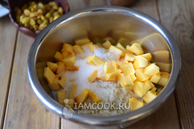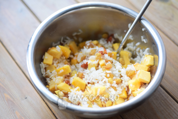 Займемся начинкой. Сегмент тыквы очистим от кожуры и семян. Мякоть тыквы нарежем маленькими кубиками и соединим с рисом в миске. Добавим сахар.
