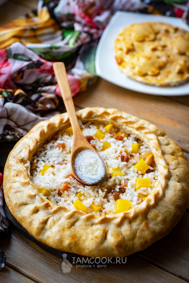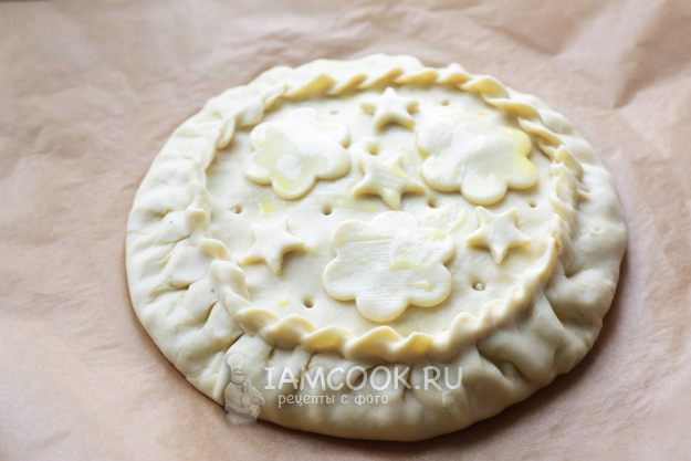 Раскатаем вторую часть теста, накроем ею начинку и скрепим края, формируя пирог. Из остатков теста можно сделать украшения на свой вкус. Выпекаем балиш с тыквой (бэлеш с тыквой) в уже разогретой до 180 градусов духовке 45 минут.