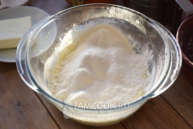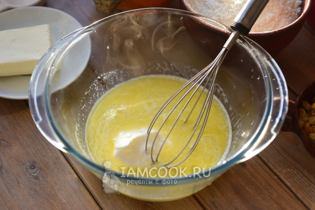В миску зальем растопленное сливочное масло и только что закипевшую воду, перемешаем. Добавим сметану и перемешаем еще раз.