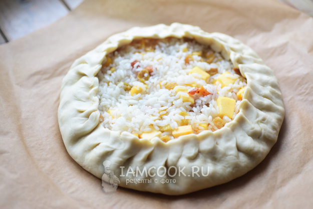 На середину выложим всю начинку и края теста защепим, как на фото.