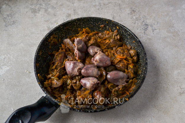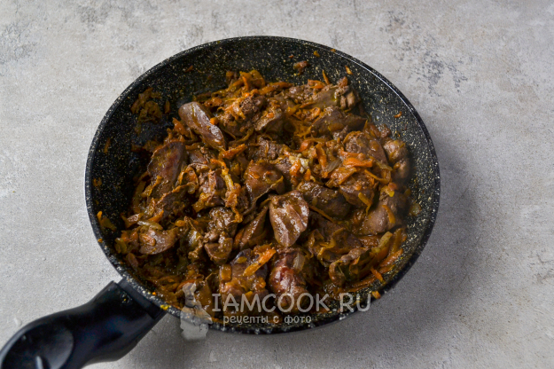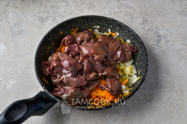 Добавьте к обжаренным моркови и луку куриную печенку.