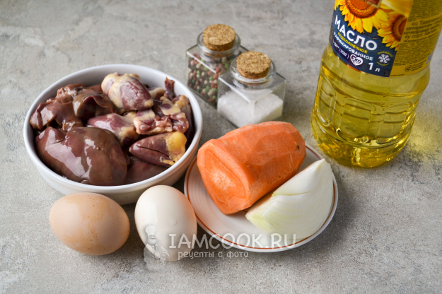 Соберите продукты для приготовления аппетитного паштета из куриной печени и сердечек. Потрошки тщательно вымойте, вырежьте жилки и пленки. Морковь и лук почистите. Яйца сварите и охладите.