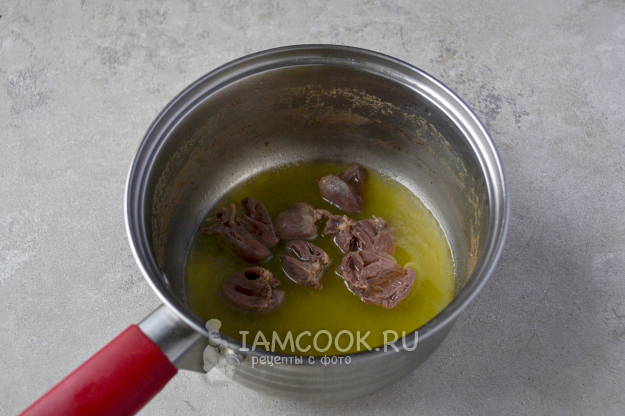 Куриные сердечки сварите в подсоленной воде в течение 40-50 минут на среднем огне.