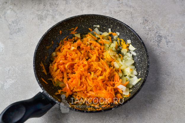 Пока сердечки варятся, приготовьте остальные ингредиенты паштета. Морковь натрите на крупной терке, лук нарежьте четверть-кольцами. Обжарьте овощи на растительном масле 8-10 минут, помешивая.