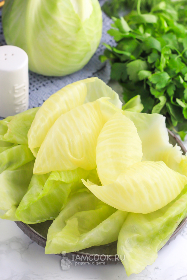 Аккуратно разверните весь вилок и срежьте плотные основания листьев. Подготовка листьев капусты для голубцов завершена! Можно начинять их фаршем и крутить голубцы.