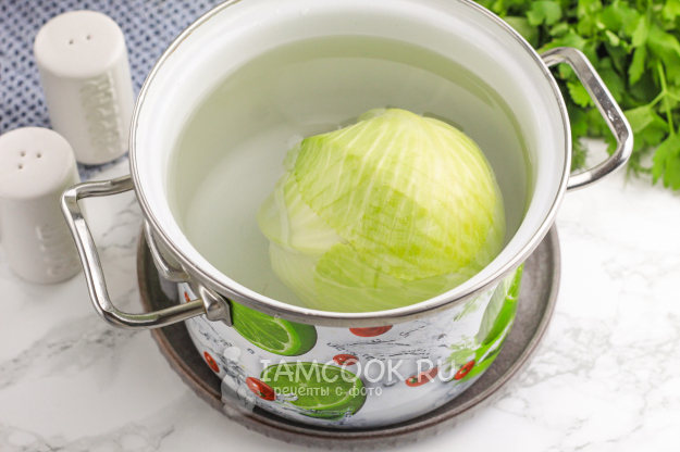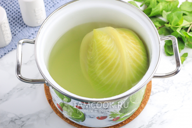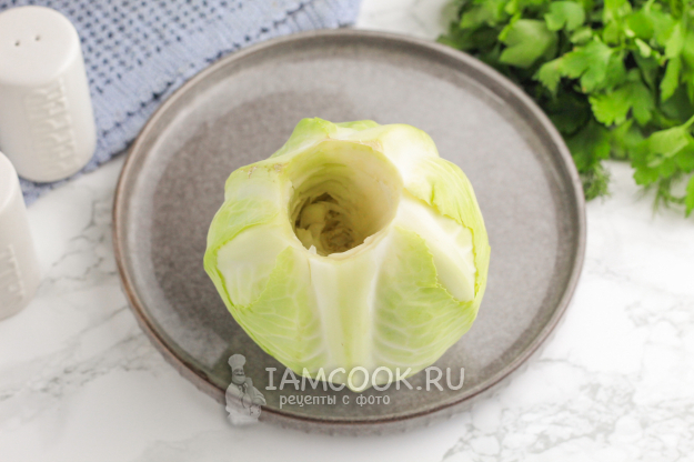 Второй способ более легкий. Снимите с вилка капусты верхние листья и удалите их. Вырежьте вглубь всю кочерыжку. Это делается для того, чтобы кипяток попал внутрь вилка и все листья сварились.