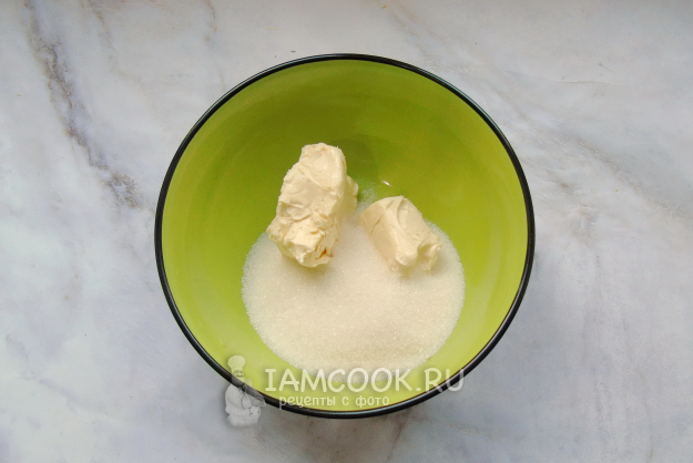 В миску выложите мягкое сливочное масло и насыпьте сахар.