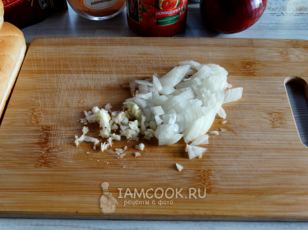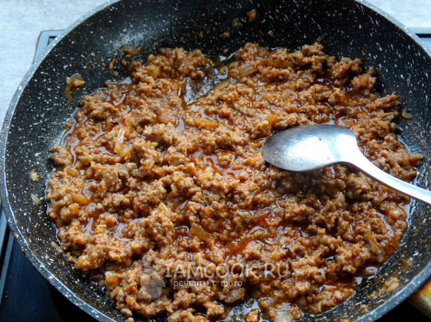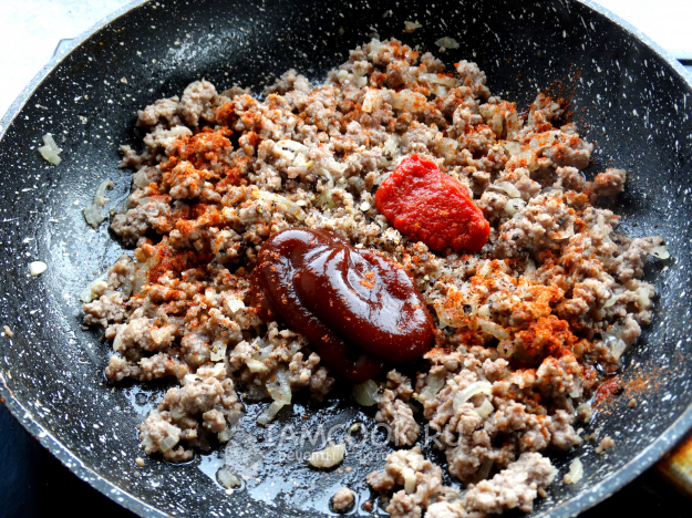 Посолить и поперчить фарш, приправить паприкой, добавить томатную пасту и соус барбекю.