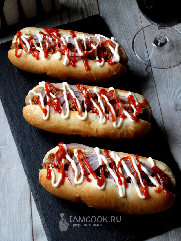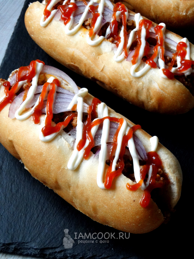 Сверху разложить тонкие перья лука, полить кетчупом и майонезом.