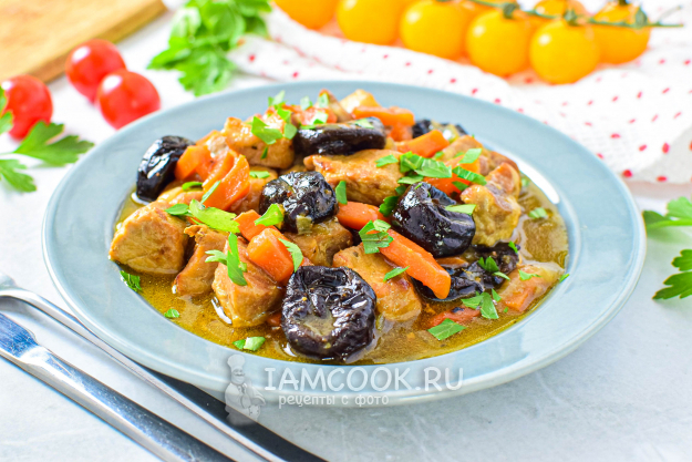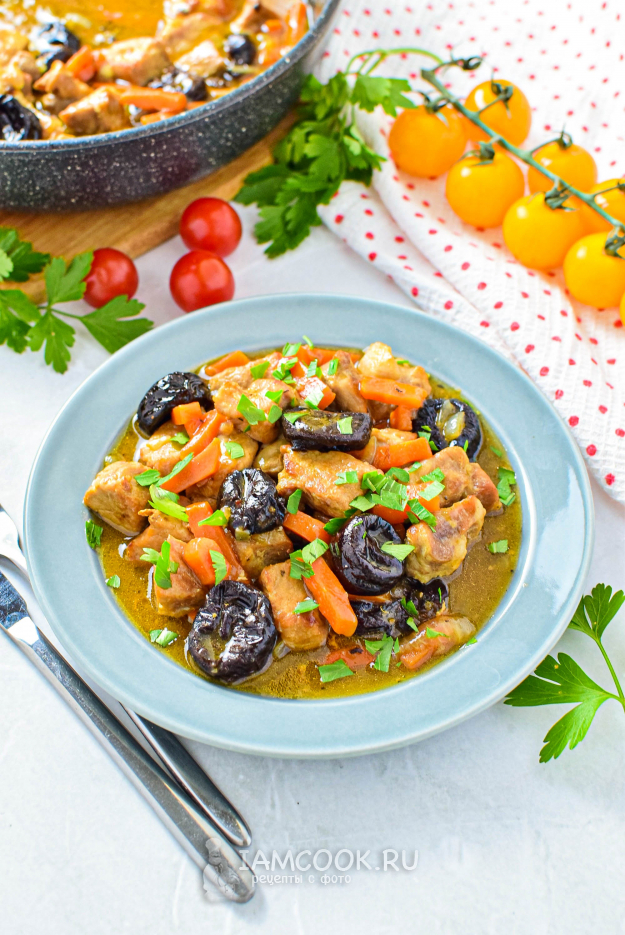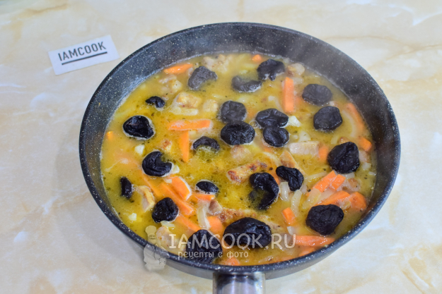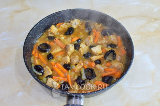 Затем залейте мясо горячей водой. Добавьте соль и специи по вкусу. Разложите чернослив. Накройте крышкой и тушите свинину с черносливом на сковороде, на небольшом огне 15-20 минут. Мясо должно стать мягким. При необходимости время тушения можно увеличить.