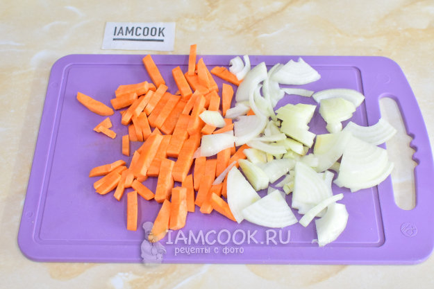 В это время очистите морковь и лук. Нарежьте морковь брусочками. Лук нарежьте полукольцами или немного мельче.
